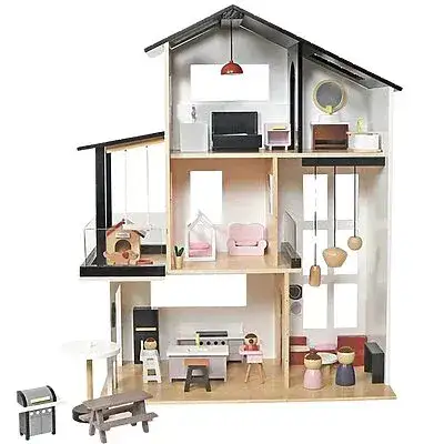 בית בובות דגם אביגל רטרו, בצבעי עץ טבעי לבן שחור, כולל ריהוט 27 חלקים מעץ.