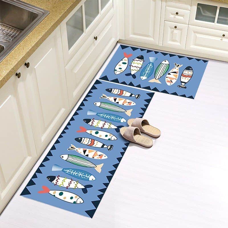סט זוג שטיחי מטבח - דגים ומשולשים תכלת