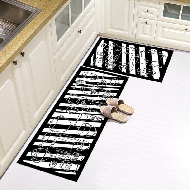 סט זוג שטיחי מטבח - כלי מטבח על פסים שחור לבן