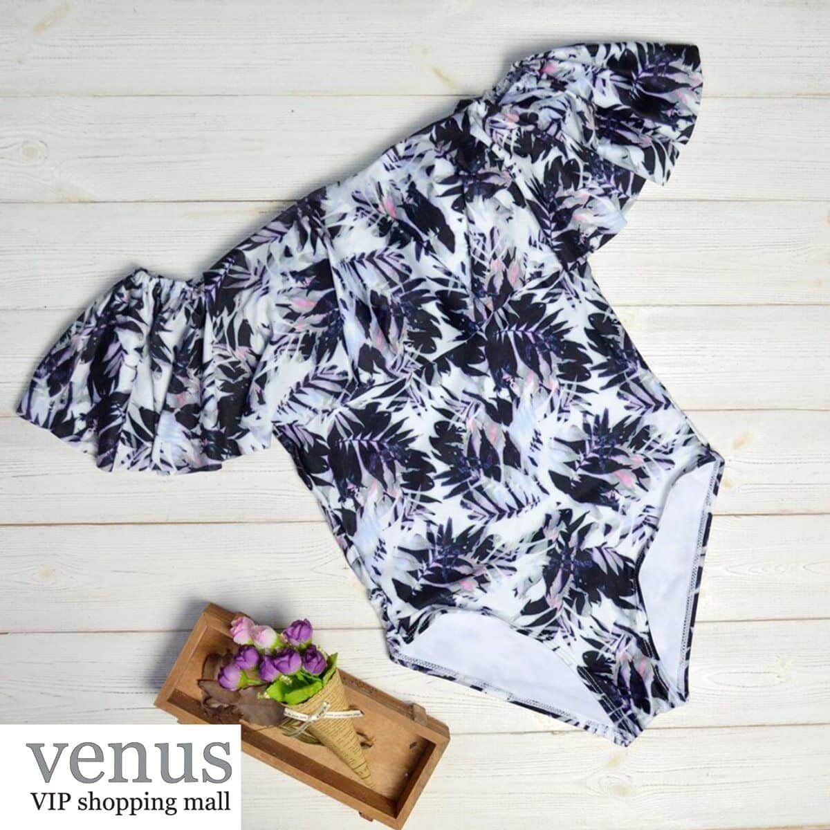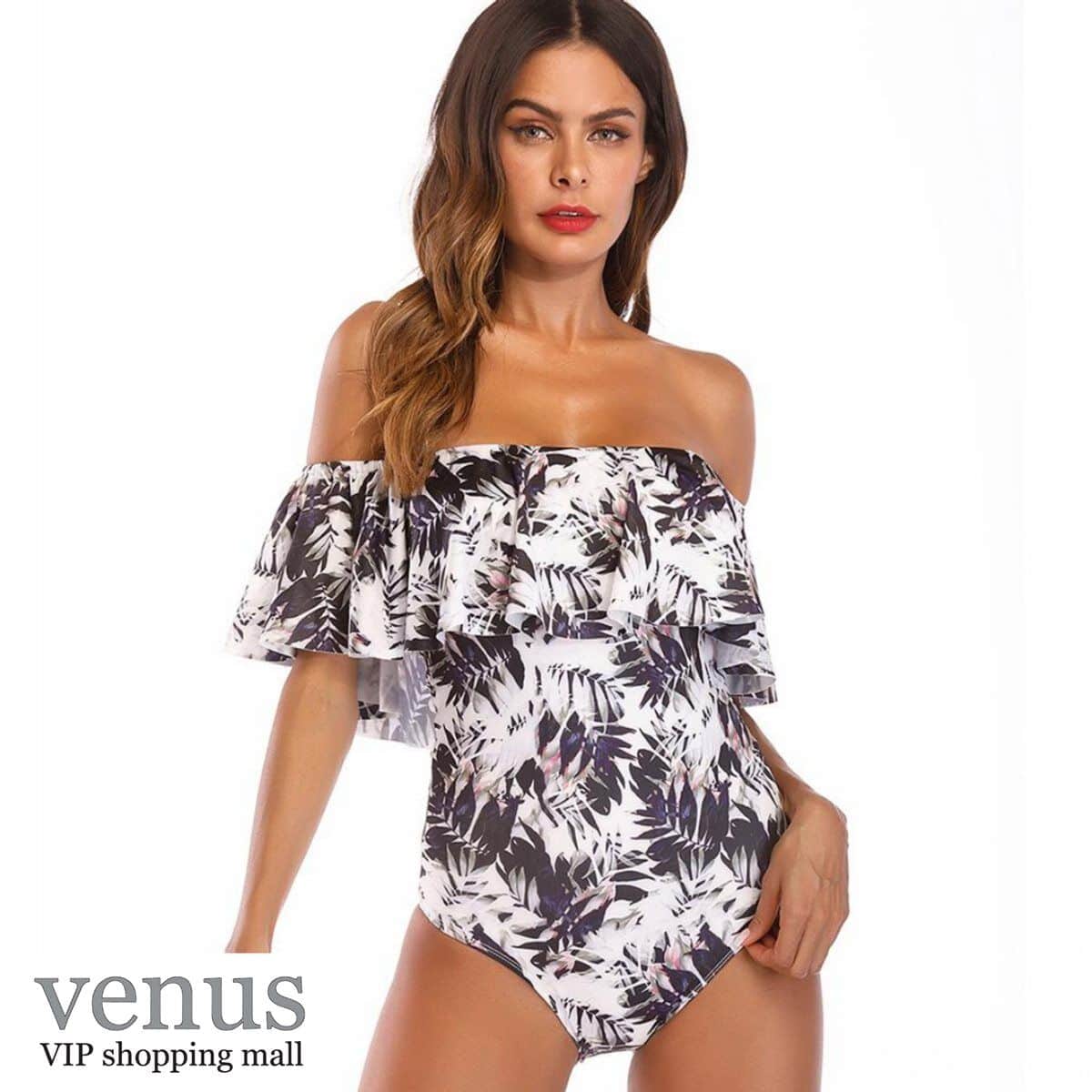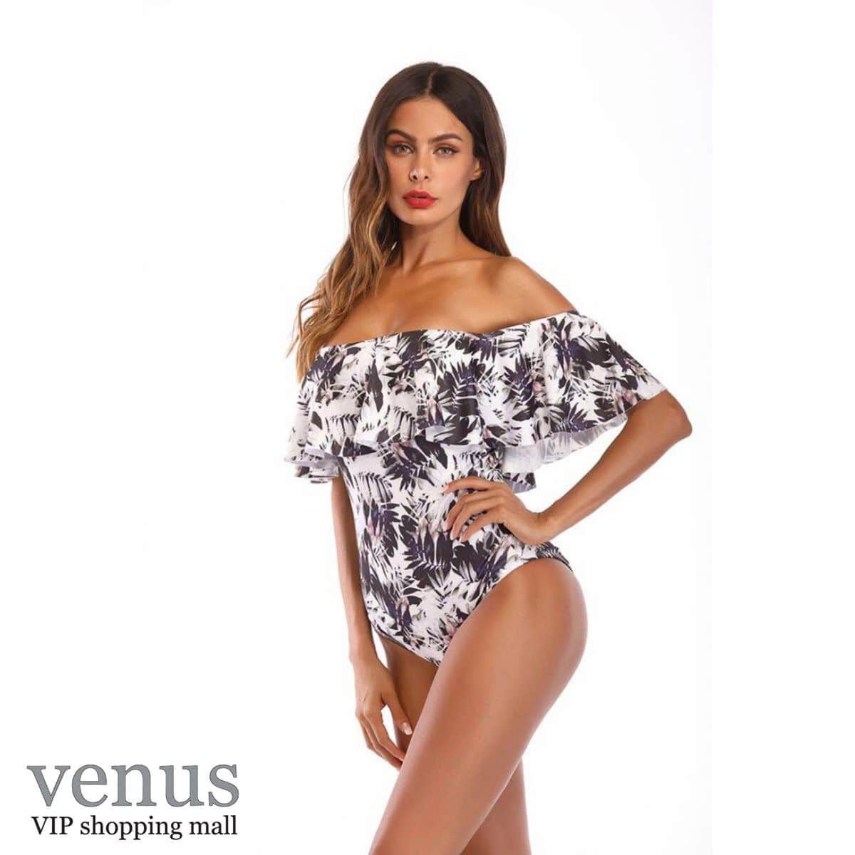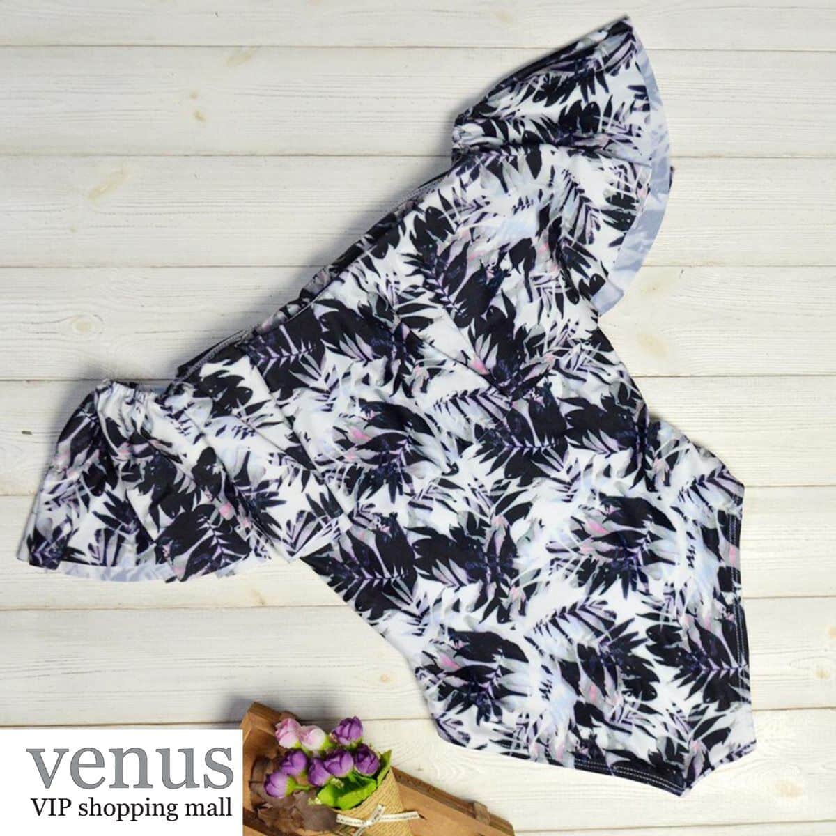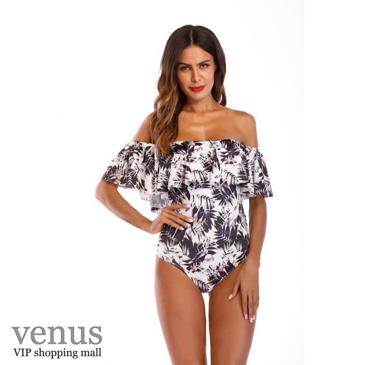 9006 - בגד ים שלם מלמלת כתפיים הדפס טרופי שחור-לבן