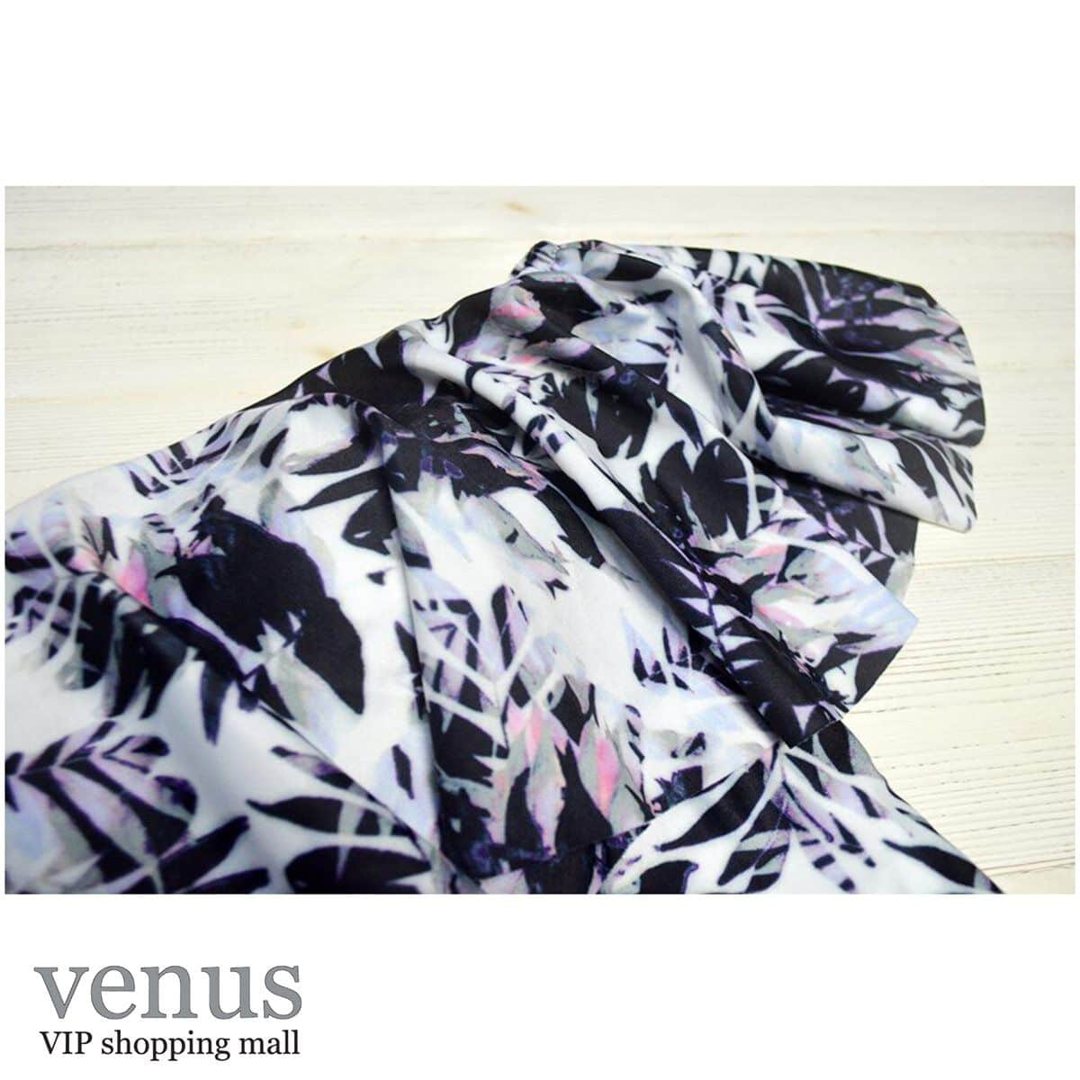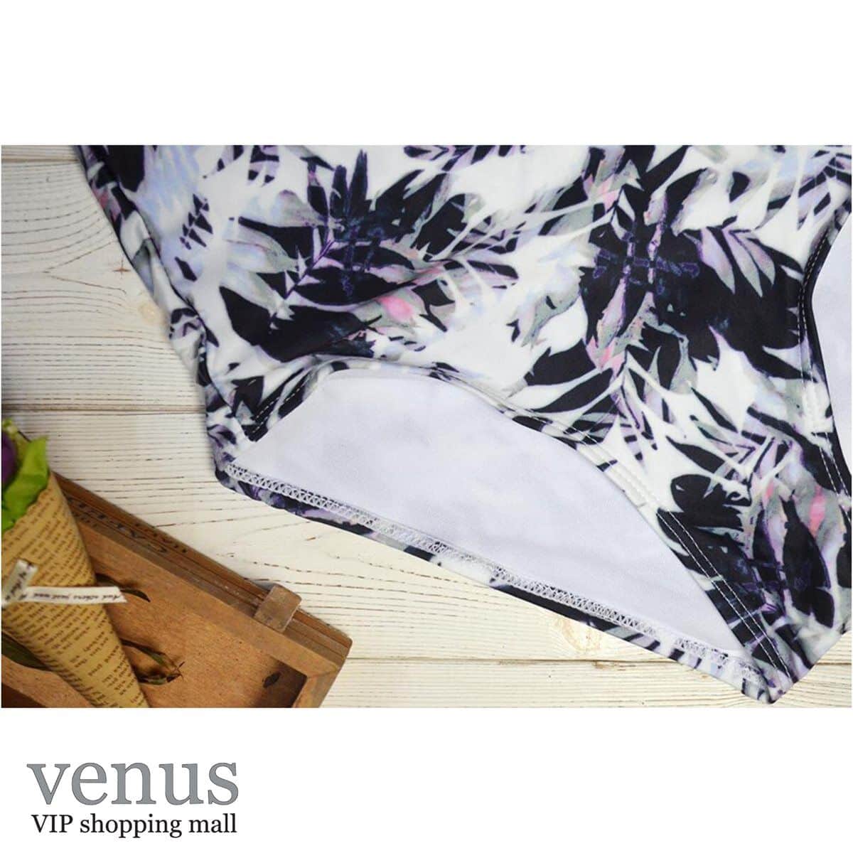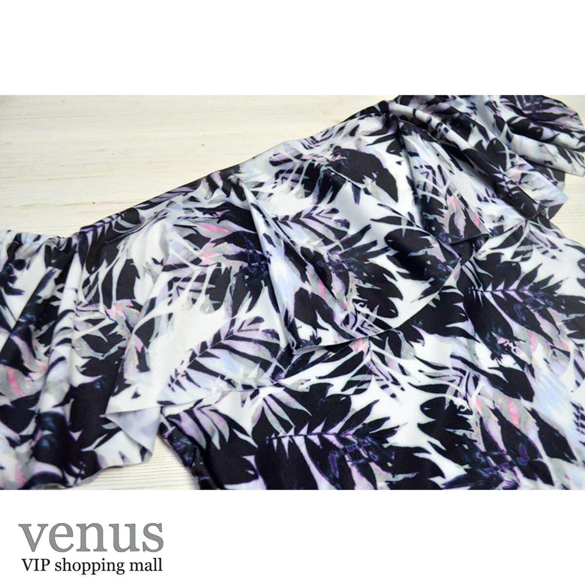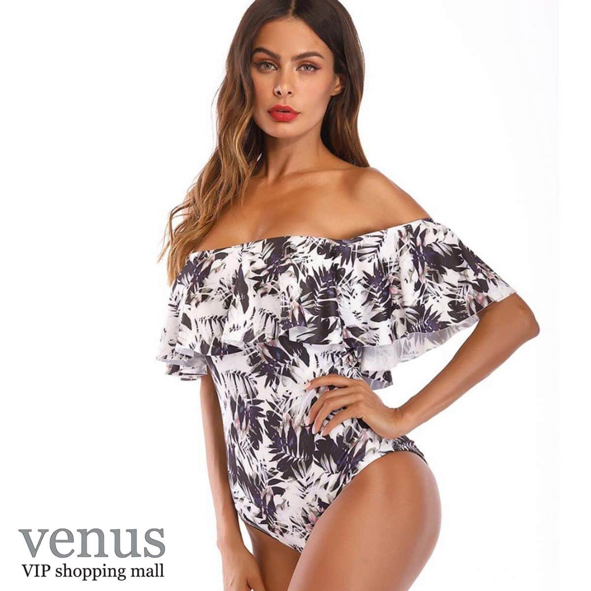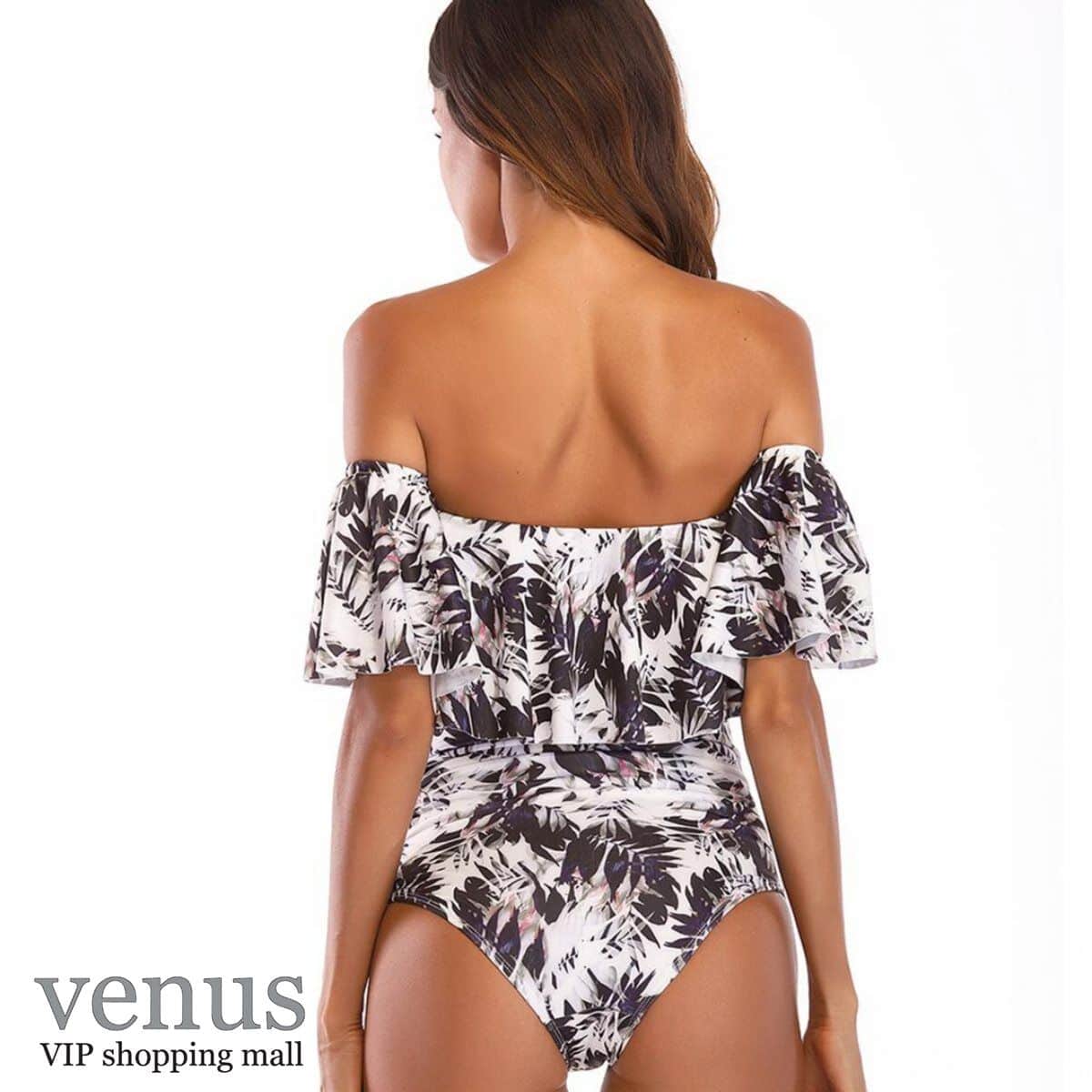 9006 - בגד ים שלם מלמלת כתפיים הדפס טרופי שחור-לבן