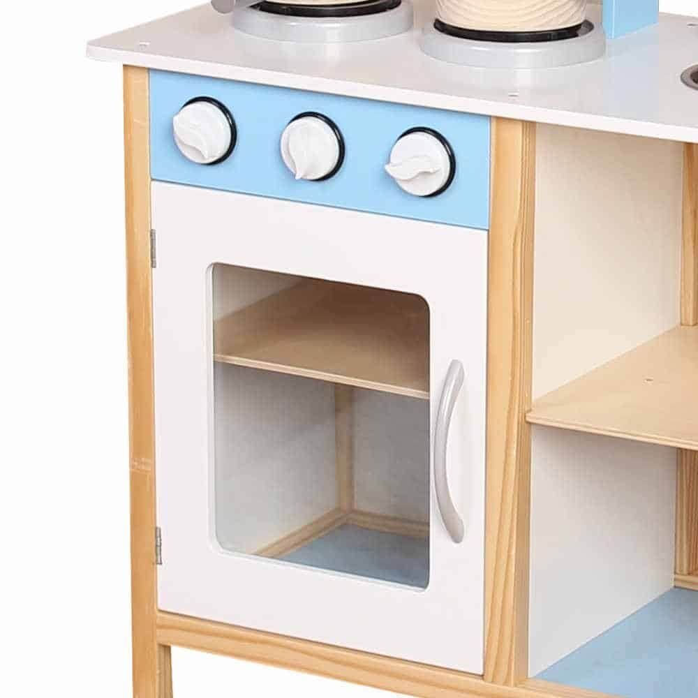 מטבח מעץ לילדים, דגם איתמר תכלת כולל כיריים, תנור, מיקרוגל, כיור,וכלי מטבח