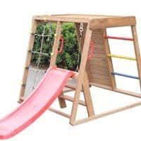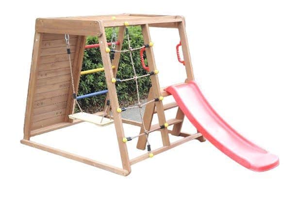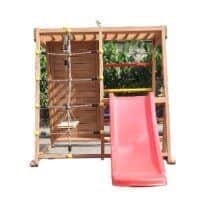 מתקן משולב לילדים מעץ אורן איכותי כולל נדנדה, מגלשה, קיר טיפוס, סולם, קיר חבלים, סולם טיפוס החלק העליון של המתקן.