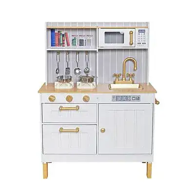 מטבח מעוצב לילדים מעץ דגם שרון בצבע לבן זהב עם כריים אלרטרונים, תנור כיור עם ברז, וכלי מטבח