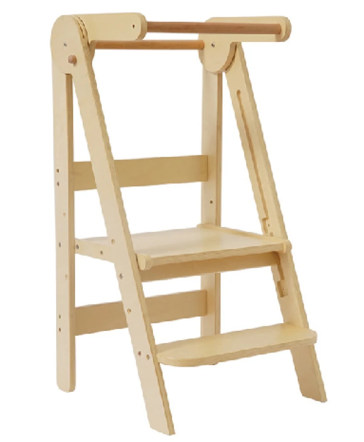 מגדל למידה מתקפל מעץ בצבע עץ ליבנה טבעי מאפשר שיתוף הילד במטבח, חדר האוכל, וחדר הילדים.