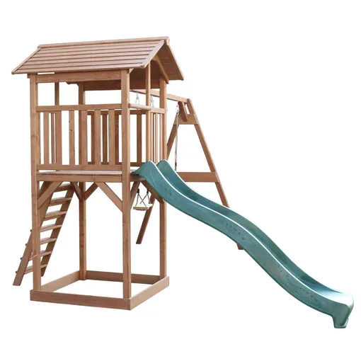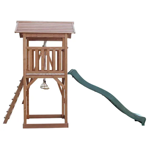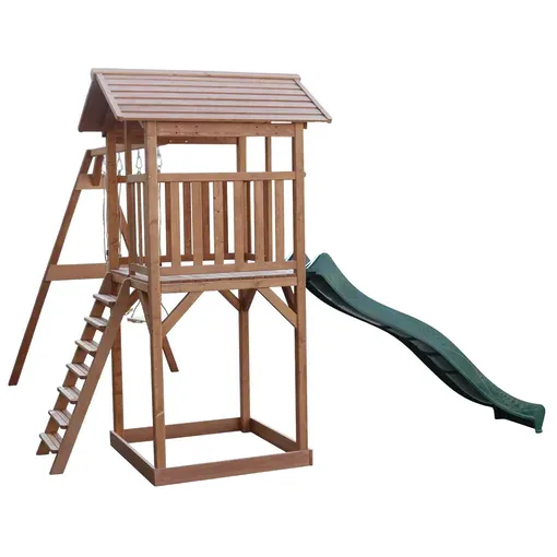בית מעץ לילדים עם מגלשה ושתי נדנדות